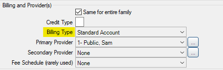 The default setting for new patients is selected in Practice Setup, though Family Module Preferences also has a selector for "New patient primary insurance plan sets patient billing type," which automatically chooses a Billing Type when a patient's Insurance Plan is changed. Note that, even if this selection is made, patient billing types will not change if an existing Insurance Plan's Billing Type is changed.