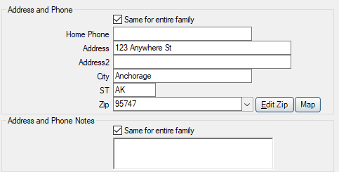 Address and phone information appears in the top right corner. It's usually the same for all family members, so the "Same for entire family" box is checked by default. Changes made to one family member in these fields will automatically be made to other family members because of this. However, the box may be unchecked to make changes for a single patient.
