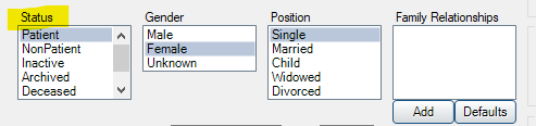 Archived: Used to denote previous patients who will not be returning, such as children who age out of a pediatric practice or a patient who moves away. Because these patients do not display in the Select Patient window, it's possible to create duplicate accounts. Note: If this selection is made, a user must have "Archived Patient Edit" Security permission to make edits.