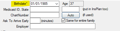 Some fields, such as Birthdate, cannot be left blank by default. They're marked with an asterisk (*) in the Patient Information window. Known as Required Fields, these selections are managed by going to Setup in the main menu and selecting Required Fields. If one of these fields is left blank, the user receives a popup prompt to go back and complete the Required Fields.