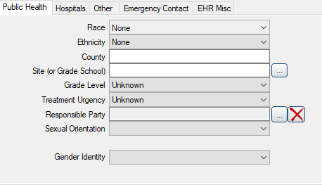 Generally used by public health professionals for Syndromic Surveillance, the EHR Misc tab can be turned on or off. See "Tabs" section above for more info. Note: If a Date Time Deceased is entered, the patient's age will lock.