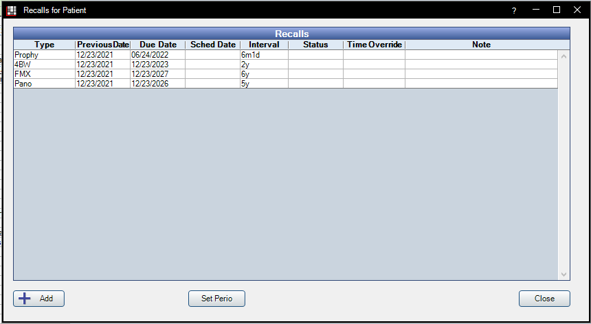 The "Set Perio" button lets you quickly toggle a prophy patient to a patient or back again. If the patient is a perio patient, you MUST set them as a perio patient by manually clicking this button. Just completing a perio procedure is not enough to trigger a perio recall. "Prophy" and "Perio" are mutually exclusive.