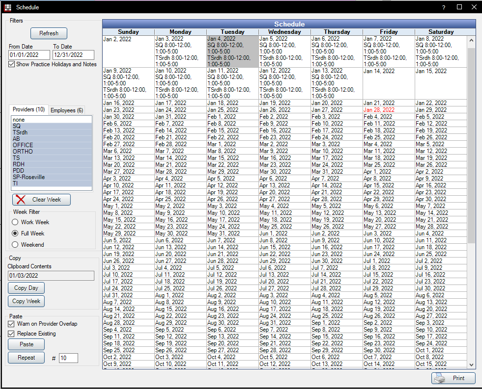 In the Paste box, you can either paste once, or paste repeatedly. Before pasting, select the new date in the main grid that you want to paste to. You can change the number in the repeat box to be fairly large. For example, you could paste 365 days, or you could paste 52 weeks. If you want to clear out multiple weeks, you do not have to repeatedly click the Clear Week button. You can instead go to a blank week, click Copy Week. Select a different date and perform a Repeat 20. That would clear out 20 weeks as long as the Replace Existing box was checked. If you do not check the Replace Existing box when pasting, then whatever you paste will be added to the existing schedule and will not cause any existing schedule items to be deleted.