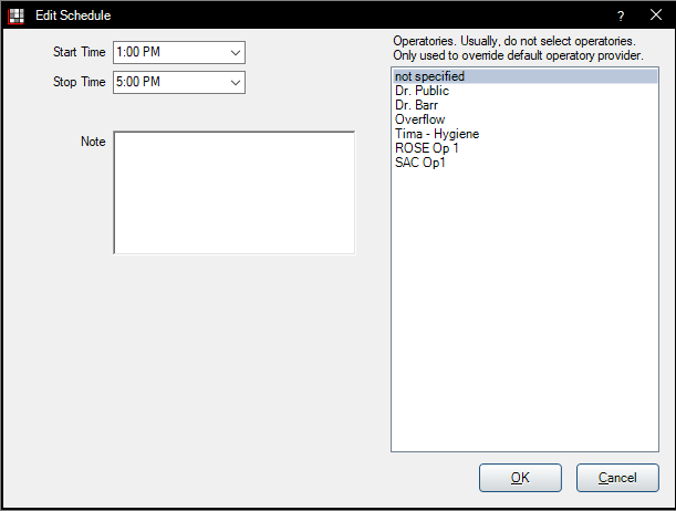 Set the time that your office opens, takes lunch, and closes each day. Use the copy/paste/repeat features to quickly fill the actual schedule. This is very powerful and allows any kind of rotating or alternating schedule by provider, by day of the week and for a specific day of the year.