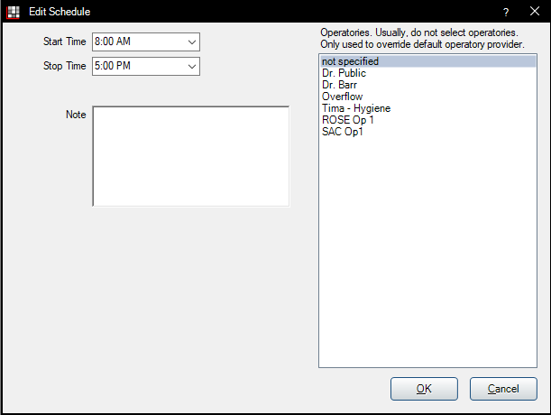 Once the times have been entered for the selected providers for the selected day, the dialog should look as follows.